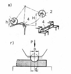 Твердость по Бринелю (НВ) определяют на зачищенной поверхности образца, в которую вдавливают стальной шарик (рис. 5, г) диаметром 5 или 10 мм под соответствующей нагрузкой в 750 или 3000 кГ и замеряют диаметр d образовавшейся лунки. Отношение нагрузки в кГ к площади лунки πd2 / 4 в мм2 дает число твердости.