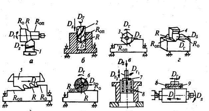 Схемы различных способов обработки резанием, используемый инструмент, а также виды движения инструмента и заготовки в процессе обработки приведены на рис.6.
