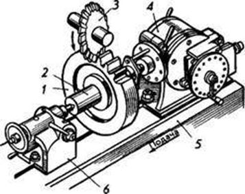 На горизонтально-фрезерном станке (рис. 41) зубчатые колеса по методу копирования нарезают дисковой модульной фрезой. Фреза 3 совершает вращательное движение, а стол станка 5 с нарезаемым колесом и делительной головкой перемещается вдоль оси колеса (продольная подача). После того как впадина зуба профрезерована полностью, стол с заготовкой, посаженной на оправку 2, и делительной головкой отводится в исходное положение, а заготовка 1 с помощью делительной головки 4 поворачивается на один зуб или на один шаг. Далее фрезеруется следующая впадина и т. д.