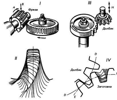 Ι – нарезание зубьев червячной фрезой; ΙΙ – положения режущих кромок червячной фрезы по отношению к профилю зубьев колес; ΙΙΙ – нарезание зубьев долбяком; ΙV – качение делительной окружности долбяка по делительной окружности заготовки.