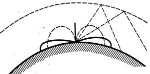Для отражения гектометровых и более длинных волн от ионосферы требуется меньшая электронная концентрация, чем для отражения декаметровых волн. Гектометровые волны сражаются от слоя Е. При этом днем они очень сильно поглощаются слоем D и даже при больших мощностях передатчиков (сотни киловатт) дневной уровень поля на этих волнах оказывается ниже уровня помех. Прием ионосферной волны на гектометровых (средних) волнах возможен только ночью. Земная волна в этом диапазоне распространяется на большие расстояния, чем на коротких волнах, что позволяет обеспечить радиовещание на расстояниях около 300...400 км при мощности передатчика 100 кВт и при использовании передающих антенн высотой 100... 200 м.