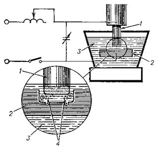 1 — инструмент; 2 — заготовка; 3 — жидкий диэлектрик;