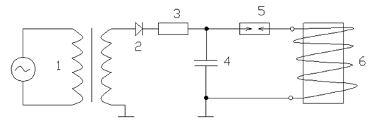 Рис.57. Принципиальная схема установки для магнитно-импульсной обработки: 1 – высоковольтный трансформатор; 2 – выпрямитель; 3 – зарядное сопротивление; 4 – конденсатор; 5 – разрядник; 6 – индуктор.
