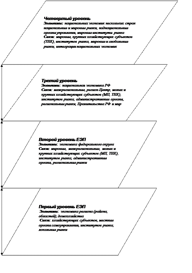 На рис. 2.3. предлагается модели взаимосвязи уровней ЕЭП. Каждый уровень ЕЭП имеет элементы и связи, отличающиеся от другого уровня масштабами и интенсивностью деятельностью экономических агентов. В этой модели важным считаем неразрывность связи уровней ЕЭП между собой и их усиление во всех сферах жизни.