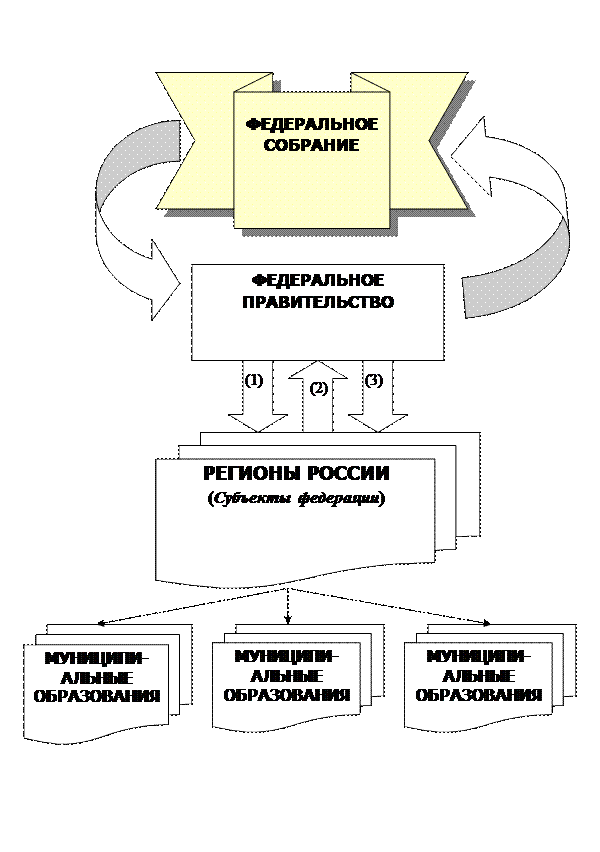 На основе вышеизложенного предлагается следующая схема проведения реформ законодательства (рис. 2.4): рекомендация Центра (проект Закона) (1)– апробация на местах; представление субъекта (скорректированный проект Закона) Центру (2) – утверждение Центра и приведение в норму Закона для исполнения (3).