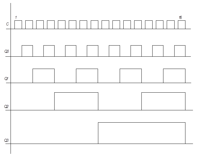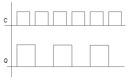 с D, а информацию в виде 101010…подавать на С, то частота сигналов на выходе Q будет в два раза меньше, чем частота на входе.