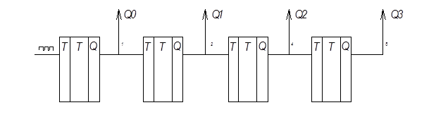 На базе триггеров можно получить счётчик импульсов преобразованием в двоичную, десятичную формулу. Счётчики – это последовательное соединение Т триггеров.
