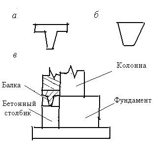 5.2.4. Железобетонные фундаментные балки (рис. 6) применяются в каркасных зданиях с шагом колонн 6 и 12 м в качестве фундаментов самонесущих кирпичных или панельных стен. Балки имеют тавровое или трапецеидальное поперечное сечение. Они устанавливаются на бетонные столбики, бетонируемые на уступах фундаментов колонн.