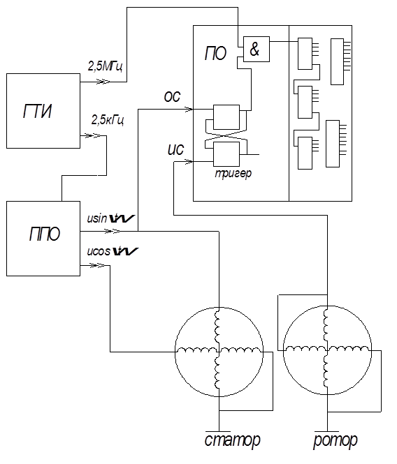 Датчики типа резольвера – информационным сигналом является сдвиг фаз снимаемый со вторичной обмотки, на первичную обмотку подается эталонная синусоеда силой 2,5кГц.