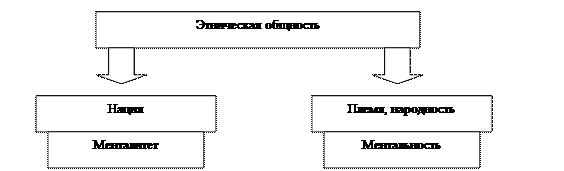 Выделим характеристики, объединяющие эти два понятия. Во-первых, менталитет и ментальность относятся к сфере коллективной психологии, во-вторых, менталитет и ментальность относятся к сфере психологии этноса, в-третьих, ментальность является упрощенной формой менталитета. Исходя из этого, можно предположить, что этническая ментальность – это первая ступень формирования национального менталитета; если национальный менталитет – это мировоззрение, то этническая ментальность – это мироощущение, национальный менталитет – атрибут нации, этническая ментальность – атрибут народности, которая еще не прошла все ступени развития, позволяющей ей стать нацией (см. рис. 10.1).