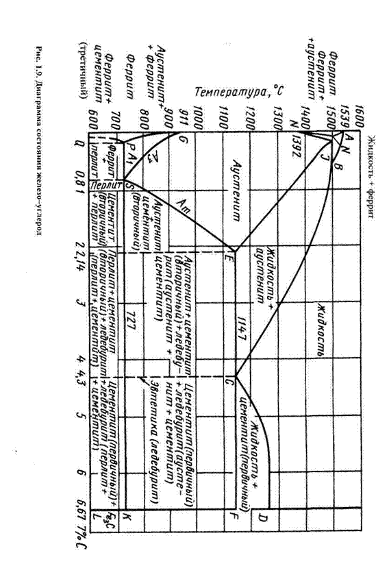 Фазой называется однородная часть системы, отделенная от других частей поверхностью раздела, при переходе через которую свойства сплава изменяются скачкообразно. На рис. 1.9 изображена диаграмма состояния железоуглеродистых сплавов, имеющая большое практическое значение.