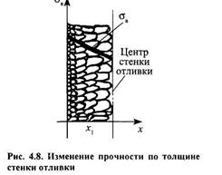 При затвердевании отливки формируется ее сложное неоднородное строение (рис. 4.8). Наружные слои стенки отливки имеют мелкозернистую плотную структуру, что объясняется высокой скоростью затвердевания из-за большой разницы между температурами формы и отливки. По мере повышения температуры формы интенсивность отвода теплоты в литейную форму уменьшается, что приводит к понижению скорости кристаллизации и увеличению размеров кристаллов. Поэтому механические свойства по сечению отливки будут различаться. Толщина стенок отливок имеет критическую величину, по достижении которой прочность отливок увеличивается непропорционально этой толщине. Например, при литье стали в песчаные формы критическая толщина стенок отливок 11... 39 мм, а для отливок из серого чугуна - 3 мм.