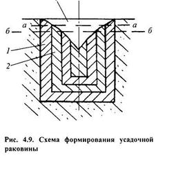 Поскольку усадка расплава при переходе из жидкого состояния в твердое превышает усадку корки, то уровень металла в незатвердевшей части отливки понижается до уровня а-а. В следующий момент времени на корке 1 нарастает новый твердый слой 2, а уровень жидкого металла понижается до уровня б-б. Так продолжается до тех пор, пока не закончится процесс кристаллизации. Снижение уровня расплава при затвердевании приводит к формированию сосредоточенной усадкой раковины 3. Сосредоточенные усадочные раковины образуются при изготовлении отливок из чистых металлов, сплавов эвтектического состава (сплав АК12) и сплавов с узким интервалом кристаллизации (низкоуглеродистые стали, безоловянные бронзы и др.).