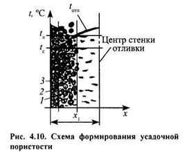 Формирование усадочной пористости объясняется наличием переходной твердожидкой зоны (рис. 4.10), в которой температура отливки изменяется от температуры ликвидуса до температуры солидуса. Вблизи температуры солидуса кристаллы 1 соприкасаются между собой. Это разобщает ячейки 2, заключающие в себе остатки жидкой фазы. Затвердевание небольшого объема металла в такой ячейке происходит без доступа к ней питающего расплава из соседних ячеек. В результате усадки в каждой ячейке получается небольшая усадочная раковина 3.