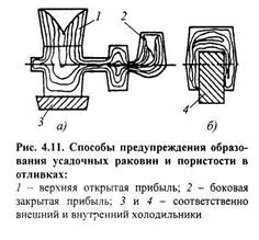 Предупредить образование усадочных раковин и пористости позволяет установка в литейную форму наружных или внутренних холодильников. Наружные холодильники 3 (см. рис. 4.11, а) устанавливают в форму с внешней стороны массивных частей отливки. Так как холодильники имеют высокую теплопроводность и теплоемкость, то отвод теплота от массивной части отливок происходит интенсивнее, чем от тонкой. Это способствует выравниванию скоростей затвердевания массивной и тонкой частей и устранению усадочных раковин и пористости.