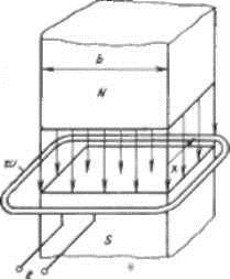 В качестве примера рассмотрим преобразователь, который представляет собой магнитную систему с постоянным магнитом, в воздушном зазоре которой перемещается катушка (рис. 15). При движении катушки с изменением х изменяется площадь катушки, находящейся в магнитном поле, Q = bх. Это приводит к изменению потокосцепления ψ = wBbx, и в катушке наводится ЭДС