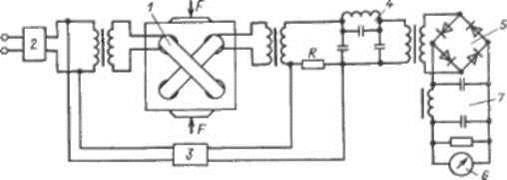 Схема включения трансформаторного магнитоанизотропного преобразователя приведена на рис 16. Первичная обмотка 1 питается от феррорезонансного стабилизатора 2. На выходе у ненагруженного преобразователя имеется некоторое остаточное напряжение. Для его компенсации в цепь включен резистор R, на который подается напряжение через фазосдвигающую цепочку 3, Напряжение питания преобразователя выбирается так, чтобы режим его работы был близок к режиму насыщения магнитной цепи. При этом на выходе преобразователя имеется напряжение верхних гармоник значительной величины. Для зашиты от гармоник схема содержит фильтр верхних частот 4. Напряжение выпрямляется двухполупериодным выпрямителем 5 и подается на магнитоэлектрический измерительный механизм 6. Фильтр нижних частот 7 служит для сглаживания пульсаций выпрямленного напряжения. При измерении быстропеременных процессов в качестве измерительного механизма включается гальванометр свeтолучевого осциллографа.