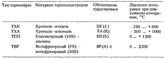 Термоэлектрические преобразователи используются для измерительного преобразования температуры в ЭДС. В таблице приведены наиболее широко используемые термопары (ГОСТ 6616-84) и их основные характеристики (ГОСТ 3044-84).