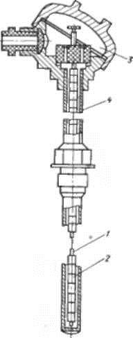 Термоэлектрический датчик обычно называется термопарой. Устройство промышленной термопары показано на рис.19. Термоэлектроды изолируются друг от друга керамическими бусами 2 или керамической трубкой; одним своим концом они свариваются, другим -подсоединяются к зажимам в головке 3, служащей для подключения внешних проводов. Термоэлектроды помешаются в защитный чехол 4 (трубку, закрытую с одной стороны). Чехол делается из жаропрочной стали, а при измерении очень больших температур - из керамики или кварца.