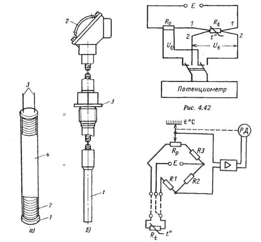 Чувствительный элемент медного терморезистора (рис. 4.41,а) представляет собой пластмассовый цилиндр /, на который бифилярно в несколько слоев намотана медная проволока 2 диаметром 0,1 мм. Сверху катушка покрыта глифталевым лаком. К концам обмотки припаиваются медные выводные провода 3 диаметром 1,0—1,5 мм. Провода изолированы между собой асбестовым шнуром или фарфоровыми трубочками. Чувствительный элемент вставляется в тонкостенную металлическую гильзу 4. Гильза с выводными проводами помещается в защитный чехол (рис 21), который представляет собой закрытую с одного конца трубку 1. На открытом ее конце помещается клеммная головка 2. Для удобства монтажа защитный чехол может иметь стланец 3.