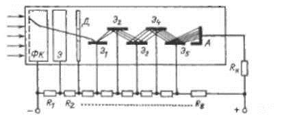 Вакуумные фотоэлементы состоят из вакуумированной стеклянной колбы, содержащей два электрода: анод и катод. При освещении фотокатода под влиянием фотонов света он эмитирует электроны. Если между анодом и фотокатодом приложено напряжение, то эти электроны образуют электрический ток; поскольку он вызван фотонами, его называют фототокомДля фотоэмиссии электронов необходимо, чтобы энергия фотона E=vh где v— частота света; h постоянная Планка, была больше работы выхода электронов Ф, характерной для данного материала фотокатода. Частота vгр=Ф/h называется красной границей фотоэффекта, а соответствующая ее длина волны λгр=с/vгр где с- скорость света, — длинноволновым порогом фотоэффекта. Если λ > λ Гр, то никакая интенсивность света не может" вызвать фотоэффект.