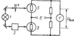 Для уменьшения погрешности измерения фотоэлектрические преобразователи включаются в дифференциальные или компенсационные измерительные цепи. Дифференциальная схема с двумя фотоэлектрическими преобразователями, служащая для измерения концентрации раствора, приведена на рис. 26. Первый луч света от источника проходит через объект измерения 2, например через кювету с исследуемым раствором, и попадает на фоторезистор 3. Второй луч проходит через применяемый для настройки прибора оптический клин 4 и попадает на второй фоторезистор 5. Фоторезисторы включены в мостовую цепь. Благодаря дифференциальной схеме компенсируются температурные и другие аддитивные погрешности. Однако вследствие разброса характеристик и параметров фотоэлектрических преобразователей каналы дифференциальной цепи несколько отличаются друг от друга, и компенсация tполучается неполной. Достоинством схемы является ее пригодность для измерения быстропеременных величин. Инерционность прибора обусловливается инерционностью фотоэлектрических преобразователей и выходного прибора.