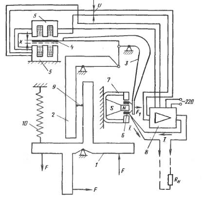 ваемая первичным преобразователем (модулем), через рычажную систему, состоящую из рычагов I, 2, передается на рычаг 3. На этом рычаге смонтирован сердечник 4 дифференциально-трансформатор-ного преобразователя 5 и катушка б магнитоэлектрического обратного преобразователя 7. Рычажная система преобразует силу F в силу F, = kF, приведенную в катушке б. Коэффициент к равен передаточному отношению рычажного механизма. Сила F1 вызывает перемещение якоря дифференциально-трансформаторного преобразователя х. При этом на его выходе появляется напряжение V = кхх. Напряжение усиливается усилителем 8 и преобразуется в ток / = кхк2х = S1х, где S1, - чувствительность прямого преобразователя, к2- коэффициент усиления усилителя. Ток проходит через сопротивление нагрузки R„ и обмотку преобразователя обратной связи б. Под действием тока обратный преобразователь развивает силу, пропорциональную току / и стремящуюся уменьшить перемещение х: