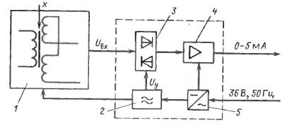 Выходное напряжение преобразователя / подается на фазочувствительный выпрямитель 3. Это управляемый выпрямитель, причем полярность выпрямленного напряжения зависит от совпадения или несовпадения фаз входного напряжения Uвхи управляющего Uу.Управляющее напряжение подается от генератора 2 и имеет постоянную фазу Фаза входного напряжения изменяется на 180 ° при изменении знака смещения якоря. Напряжение на выходе фазочувствительного выпрямителя пропорционально смещению якоря и имеет полярность, зависящую от его направления. Это напряжение усиливается усилителем 4 и преобразуется в унифицированный токовый сигнал 0-5 мА. Для увеличения стабильности усилитель имеет отрицательную обратную связь. Изменением глубины обратной связи регулируется максимальное значение выходного тока. Все элементы схемы питаются от сети переменного тока через источник стабилизированного напряжения 5.