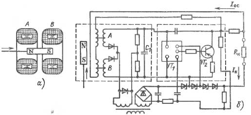 Магнит i(модуляционные датчики. Схема модуля с магнитомодуляционным преобразователем приведена на рис 33 Он состоит из магнитомодуляционного преобразователя (рис 33 ) и электронного блока (рис 33). Магнитомодуляционный преобразователь имеет две катушки, намотанные на кольцевые ферромагнитные сердечники. Сносно с катушками в соответствии со значением измеряемой величины перемещается постоянный магнит N - 5. Его перемещение вызывает изменение индукции в сердечниках катушек и, следовательно, индуктивности катушек. Например, при перемещении сердечника вправо индукция в катушке А уменьшается, а в катушке В возрастает. При этом в соответствии с кривой намагничивания магнитная проницаемость сердечника катушки А возрастает, а у сердечника В падает. Это вызывает увеличение индуктивности катушки А и уменьшение индуктивности катушки В. Катушки А и В включены в схему моста переменного тока с выпрямителем. Выпрямленное напряжение на конденсаторе С\ пропорционально перемещению магнита, а его полярность зависит от направления перемещения. Это напряжение усиливается усилителем постоянного тока, построенного на интегральном усилителе VT1 н транзисторе VT2, и преобразуется в ток, который через линию дистанционной передачи поступает в сопротивление нагрузки RH. Ток Iос, пропорциональный току нагрузки/н, поступает в обмотку обратной связи, размещенную на магнитопроводе магнитомодуляциоцного преобразователя. Созданный этим током магнитный поток компенсирует изменение магнитного потока, вызванное перемещением постоянного магнита, т. е. обеспечивает действие обратной связи. Благодаря этой связи уменьшается погрешность, вызванная нестабильностью усилителя, гистерезисом магнитомодуляциоцного преобразователя и другими причинами. Магнитомодуляционные преобразователи используются для построения датчиков давления и разности давлений, аналогичных датчикам с электросиловым преобразователем.