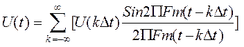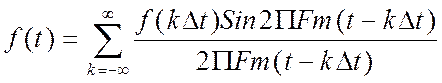 Эта теорема утверждает, что если сигнал f(t) имеет преобразование Фурье Sf(w) отличное от нуля при частотах меньших 2pFm. То в отсчетах сигнала f(kDt) взятых через интервал Dt=1/2Fm содержится вся информация о непрерывной функции f(t). Из теоремы следует, что эти отсчеты содержат информацию о сигнале f(t) в любой момент времени. Однако частота отсчетов должна быть по крайней мере в два раза больше высшей частоты сигнала Fm.