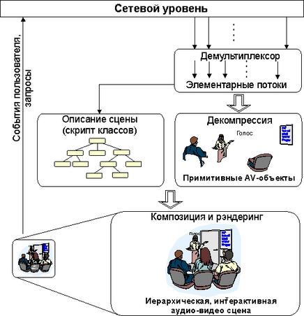Рисунок 3 показывает как потоки, приходящие из сети (или запоминающего устройства), как потоки TransMux, демультиплексируются в потоки FlexMux и передаются соответствующим демультиплексорам FlexMux, которые извлекают элементарные потоки. Элементарные потоки (ES) анализируются и передаются соответствующим декодерам. Декодирование преобразует данные в AV объект и выполняет необходимые операции для реконструкции исходного объекта AV, готового для рэндеринга на соответствующем аппарате. Аудио и визуальные объекты представлены в их кодированной форме, которая описана в разделах 10 и 9 соответственно. Реконструированный объект AV делается доступным для слоя композиции при рэндеринга сцены. Декодированные AVO, вместе с данными описания сцены, используются для композиции сцены, как это описано автором. Пользователь может расширить возможности, допущенные автором, взаимодействовать со сценой, которая отображается.