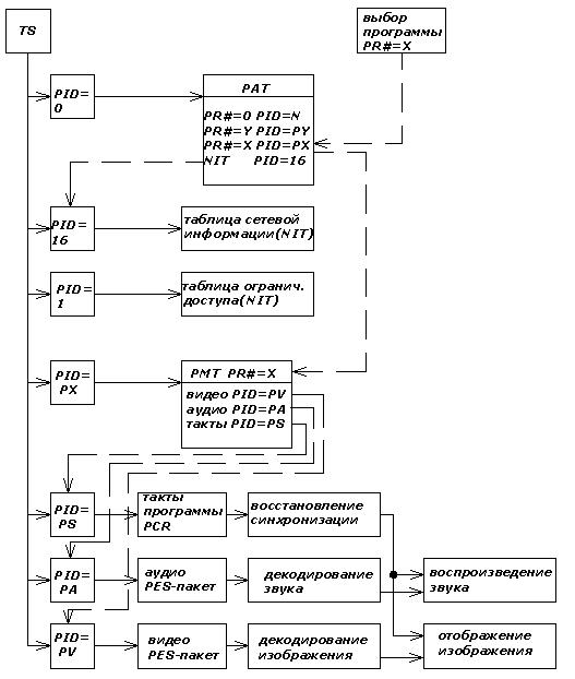 Декодер таблицы ассоциации программ PAT идентифицирует идентификаторы пакетов PID, содержащие сетевую информацию, и различные таблицы структуры программы РМТ.
