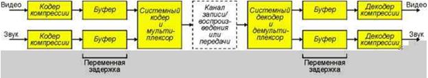Кадры телевизионного изображения поступают на вход кодера MPEG-2 с постоянной частотой, точно с такой же частотой должны воспроизводиться кадры телевизионного изображения на выходе декодера. Это означает, что общая задержка в системе, представляющая собой сумму задержек в отдельных элемента схемы, должна быть постоянной (рисунок 3.15). Объем данных, необходимый для представления кодированных изображений, не является постоянной величиной. Он зависит от детальности изображения, от наличия быстро перемещающихся объектов, от способа кодирования (I, P и B изображения характеризуются разными объемами данных). Энтропийное кодирование формирует слова с переменной длиной. А для равномерной загрузки канала связи данные должны следовать с постоянной скоростью. Проблема решается за счет использования буфера кодера (данные поступаю в буфер с переменной скоростью, а выходят – с постоянной).