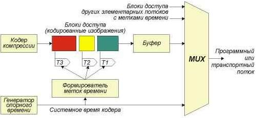 Механизм, обеспечивающий компенсацию задержек и синхронизацию – метки времени, которые ставятся в соответствие каждому блоку доступа (рисунок 8.10) и которые сообщают декодеру точное время, когда блок доступа должен быть извлечен из буфера декодера и декодирован. Для того, чтобы придавать блокам доступа метки времени, кодер должен знать текущее системное время, обеспечиваемое генератором опорного времени. Но метки времени блоков доступа не являются копиями текущего времени. Надо помнить, что метка времени указывает время, когда декодер будет декодировать данный блок доступа, что должно произойти в будущем. Поэтому должен быть некоторый сдвиг между текущим временем и меткой. Насколько велик должен этот сдвиг, зависит от многих факторов, среди которых размер буферов кодера и декодера, скорость, с которой элементарный поток поступает в мультиплексор. Сдвиг должен быть достаточно большим, чтобы блок доступа прошел через буфер кодера, мультиплексор и был полностью записан в буфер декодера. При расчете сдвига надо также предотвратить возможное переполнения или полное опустошения буфера декодера, ведь и в том, и в другом случае возникает сбой в непрерывном воспроизведении декодированных изображений. Для этого в кодере используется гипотетический декодер, который подключен к выходу кодера. Конечно, это не настоящий декодер, а вычислительная модель, сопровождаемая определителем степени заполнения буфера декодера. Назначение моделей – наложить ограничения на процесс кодирования с целью обеспечения отсутствия переполнения или полного освобождения емкости буфера декодера. Данные о степени заполнения буфера сообщаются реальному декодеру, чтобы он мог сопоставить вычисленные значения с текущими значениями аналогичных параметров в процессе настоящего декодирования.