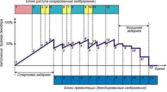 Требуется некоторое время (стартовая задержка), чтобы декодер смог декодировать и воспроизвести первое изображение, а после этого допустить выгрузку из буфера первого блока доступа. Спустя некоторое время после загрузки последнего блок доступа декодер сможет воспроизвести последнее декодированное изображение (финишная задержка). В этот момент буфер полностью опустошается.