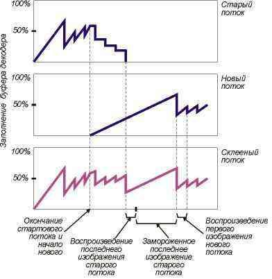 Желательно, чтобы линия, показывающая заполнение буфера, колебалась вокруг значения в 50% и не подходила к предельным значениям 0 и 100%. Есть и другие соображения, которые надо учитывать при склейке. Если, например, стартовая задержка нового потока значительно больше финишной задержки старого, то после того, как будет воспроизведено и выгружено из буфера последнее изображение старого потока, то придется долго ждать декодирования и воспроизведения первого изображения нового потока (рисунок 3.20).