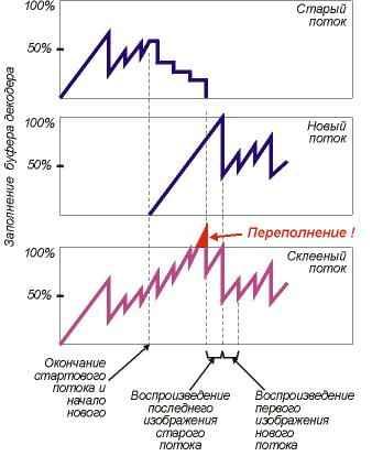 Это приведет, например, к замораживанию последнего изображения старого потока и заметной склейке. Если, например, скорость нового потока значительно больше скорости старого, то склейка будет еще более заметной (рисунок 3.21), поскольку при этом буфер переполняется и часть данных теряется.