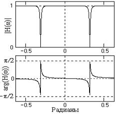 При подстановке коэффициентов в уравнение (6.2.7') и замене z = exp(-jω) может быть получена частотная передаточная функция фильтра, которая приведена на рис. 6.2.4: