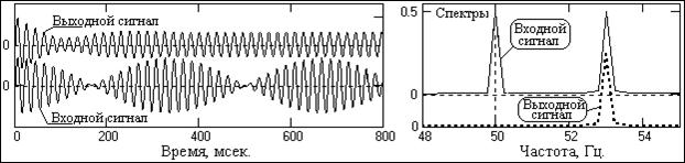 На рис. 6.2.5 приведен модельный входной сигнал фильтра, состоящий из суммы двух равных по амплитуде гармоник с частотой 50 и 53 Гц, и сигнал на выходе фильтра (смещен вверх). Справа на рисунке приведены спектры входного и выходного сигналов. Спектр выходного сигнала зарегистрирован после интервала установления реакции фильтра, который хорошо заметен на начальной части графика выходного сигнала. После установления сигнал на выходе фильтра практически полностью освобожден от гармоники 50 Гц.