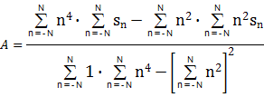 Рассчитываются и анализируются аналогично. Рассмотрим квадратный многочлен вида y(t)=A+B·t+C·t2. Для упрощения анализа ограничимся симметричным сглаживающим НЦФ с интервалом дискретизации данных Dt=1.