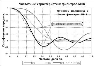 Модификация фильтров. Фильтры МНК второго порядка (равно как и другие фильтры подобного назначения) также можно модифицировать по условию H(w) → 0 при w → p. Один из простейших методов модификации заключается в следующем. В выражение передаточной функции (со всеми коэффициентами фильтра, вида (10.1.7)) подставляем z = exp(-jw), заменяем значения концевых коэффициентов фильтра на параметры, принимаем w = p, и, приравняв полученное выражение нулю, находим новые значения концевых коэффициентов, после чего сумму всех коэффициентов нормируем к 1 при w = 0.