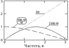 Оператор первой производной является нечетной функцией и имеет мнимый спектр. Если принять s(t) = exp(jwt), то истинное значение первой производной должно быть равно: s'(t) = jw exp(jwt). Передаточная функция H(w) = jw. Оценка первой производной в точке n = 0 по разностному оператору при Dt = 1: s'(0) = (exp(jw)-exp(-jw))/2 = j sin w = H1(w). Отношение расчетного значения к истинному на той же точке: K1(w) = sin(w)/w. Графики функций в правой половине главного диапазона приведены на рис. 10.2.8.