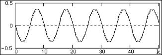 На рис. 10.2.9 показан пример дифференцирования гармоники с частотой 0.1 частоты Найквиста (показана пунктиром) и этой же гармоники с наложенными шумами (сплошная тонкая кривая).