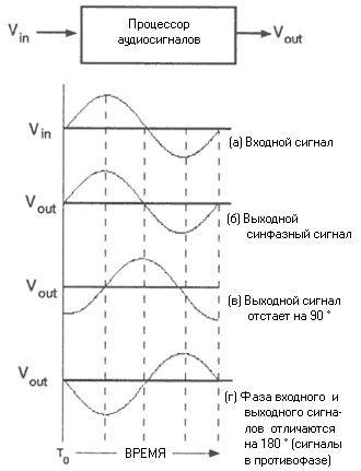 Точкой отсчета фазы может служить и другой сигнал. В этом случае опорный сигнал должен повторять форму сигнала, фазу которого измеряют. На рис. 1.3.1 показан процессор аудиосигналов с одним входом VIN и одним выходом VOUT. Здесь фаза выходного сигнала определяется относительно входного.