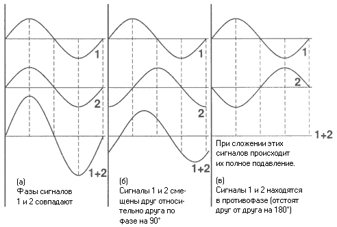 Синусоидальные волны, показанные на рис. 1.4.1а, синфазны, поэтому при их сложении получается волна с удвоенной амплитудой. Синусоидальные волны, изображенные на рис 1.4.1б отличаются по фазе на 90°, поэтому амплитуда образующейся в результате их сложения синусоидальной волны в 1,414 больше, чем амплитуда исходных волн. Фаза синусоидальных волн на рисунке 1.4.1в отличается на 180°, поэтому при их сложении происходит полное подавление сигнала.