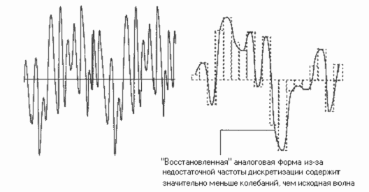 Точно то же самое происходит и в случае звукозаписи. При недостаточной частоте дискретизации пропускаются "пики" или, наоборот "впадины" звуковой волны, в результате чего регистрируемая частота оказывается значительно меньше реальной.
