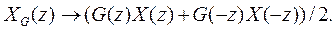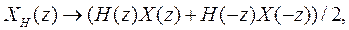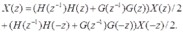 Пусть теперь вектор Y (z) перед кодированием прореживается вдвое, а перед восстановлением исходного сигнала доводится до исходной длины вставкой нулей между соседними значениями его элементов. При этом z-преобразование из Y (z) превращается в (Y (z)+ Y (- z))/2. Получим z-преобразования компонент перед восстановлением: