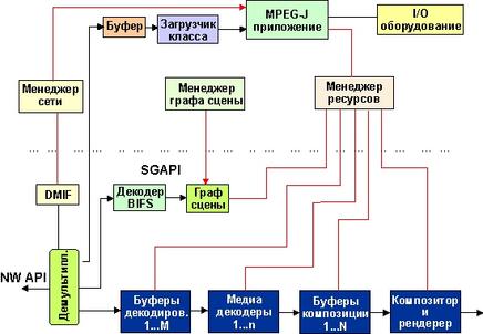 MPEG-J является программной системой a programmatic system (в противоположность параметрической системе MPEG-4 версия 1), которая специфицирует API для кросс-операций медиа-проигрывателей MPEG-4 с программами на Java. Комбинируя среду MPEG-4 и безопасный исполнительный код, разработчики материала могут реализовать комплексный контроль и механизмы обработки их медиа в рамках аудио-визуальной сессии. Блок-схема плеера MPEG-J в среде системного плеера MPEG-4 показана на рис. 10. Нижняя половинка этого рисунка отображает системный параметрический плеер MPEG-4, называемый также средство презентации (ДП). Субсистема MPEG-J, контролирующая ДП, называется средством приложения (Application Engine), показана в верхней половине рис. 10.