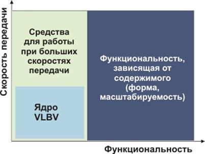 Расширенные алгоритмы и средства MPEG-4 для функциональности, зависящей от содержимого, могут рассматриваться как супер набор ядра VLBV и средств для работы при высоких потоках данных.