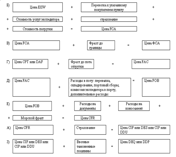 Руководствуясь тем, что цены при экспортно-импортных операциях соответствуют условиям "Инкотермс", приведем в общем виде схему расчета, (калькуляции), в которой в зависимости от условий поставки по возможности: учитываются все предлагаемые виды расходов: